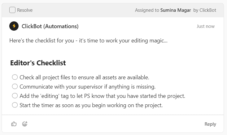 Note: There's no need to mention the team member if the specific task has already been completed. For screen recordings, please mention the Script writer.